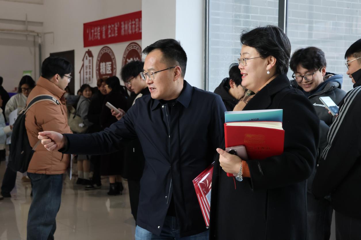招聘会现场,企业与学生交流互动频繁,氛围热烈非凡。简历投递环节,医学院报告厅大厅里,学生们手持精心准备的简历,满怀期待与企业代表面对面交流。企业展位前人头攒动,学生们积极推介自身优势与专业技能,企业代表则耐心解答疑问、介绍岗位详情与职业前景,双向沟通高效顺畅。针对未返校学生,毕业班辅导员则贴心代劳,确保其求职之路无缝衔接。
