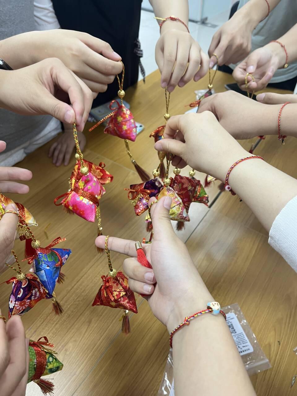 活动包含三大精彩环节:在“端午文化讲堂”中,学生党员李远远生动讲述了端午节的起源、习俗及其文化内涵。重点解析屈原精神,深刻阐释了爱国主义精神的时代传承;“巧手制香囊”环节让大家亲手制作寓意吉祥的艾草香包,体验传统手工艺的魅力;“五彩绳编织”活动,则以象征五方五行的彩绳为媒,传递美好祝福。活动现场艾香阵阵,欢声笑语不断。随后,同学们围绕“新时代青年如何传承端午文化中的爱国精神”展开热烈讨论。