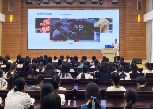 说到“艾滋病的危害”时,毕主任在大屏幕上投放了许多触目惊心的图片,并告诫台下的学生们要科学“防治艾滋”,在外要保护好自己的人身安全!同时,也不要歧视艾滋病患者,应当给予他们关爱,让他们积极投身到美好社会的建设中来。