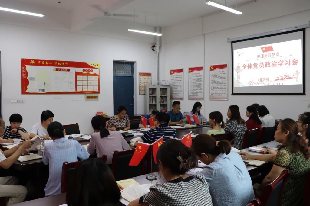 7月2日下午,护理系党总支在党员活动室举行全体党员政治学习会,深入学习贯彻习近平总书记在庆祝中国共产党成立100周年大会上的重要讲话精神。全体党员教师参加学习活动,系党总支书记蔡季秋主持会议。