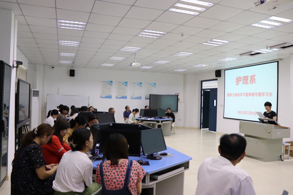 7月9日上午,护理系在B3-PBL室举行全体全体教职工政治学习暨师德专题学习会,深入学习贯彻习近平总书记在庆祝中国共产党成立100周年大会上的重要讲话精神。全体教职工参加学习活动,系党总支书记蔡季秋主持会议。