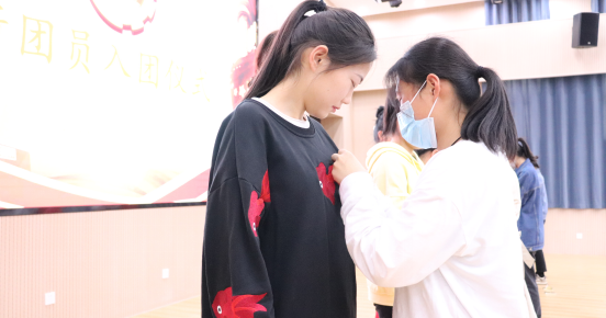 在庄严的国歌声中,全体师生起立,怀着崇敬的心唱响国歌,为入团仪式拉开序幕。张书记宣布新团员名单,老团员为新团员佩戴团徽并由团总支副书记樊心悦带领新团员宣誓。新老团员面向团旗、右手握拳举过肩,在团旗下庄严宣誓。忠诚许下的并不只是青年的言语承诺,这一份热血忠贞更是日后青年长在骨血里不忘的志向。